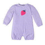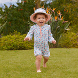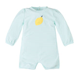 Snap closure at crotch of Sunzie makes changing diapers a breeze.Ruched Shoulders
