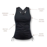 Straps cross at back for additional support and a modern look.Internal Shelf Bra
